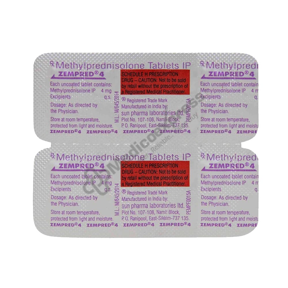 Zempred 4 Tablet 10's Contain The Corticosteroid Prednisolone. Corticosteroids And Anabolic Steroids Are Not The Same Thing. It Relieves Symptoms By Preventing The Release Of Chemicals That Cause Inflammation (Redness And Swelling) And Allergies.Disclaimer:For More Information Contact Your Physician