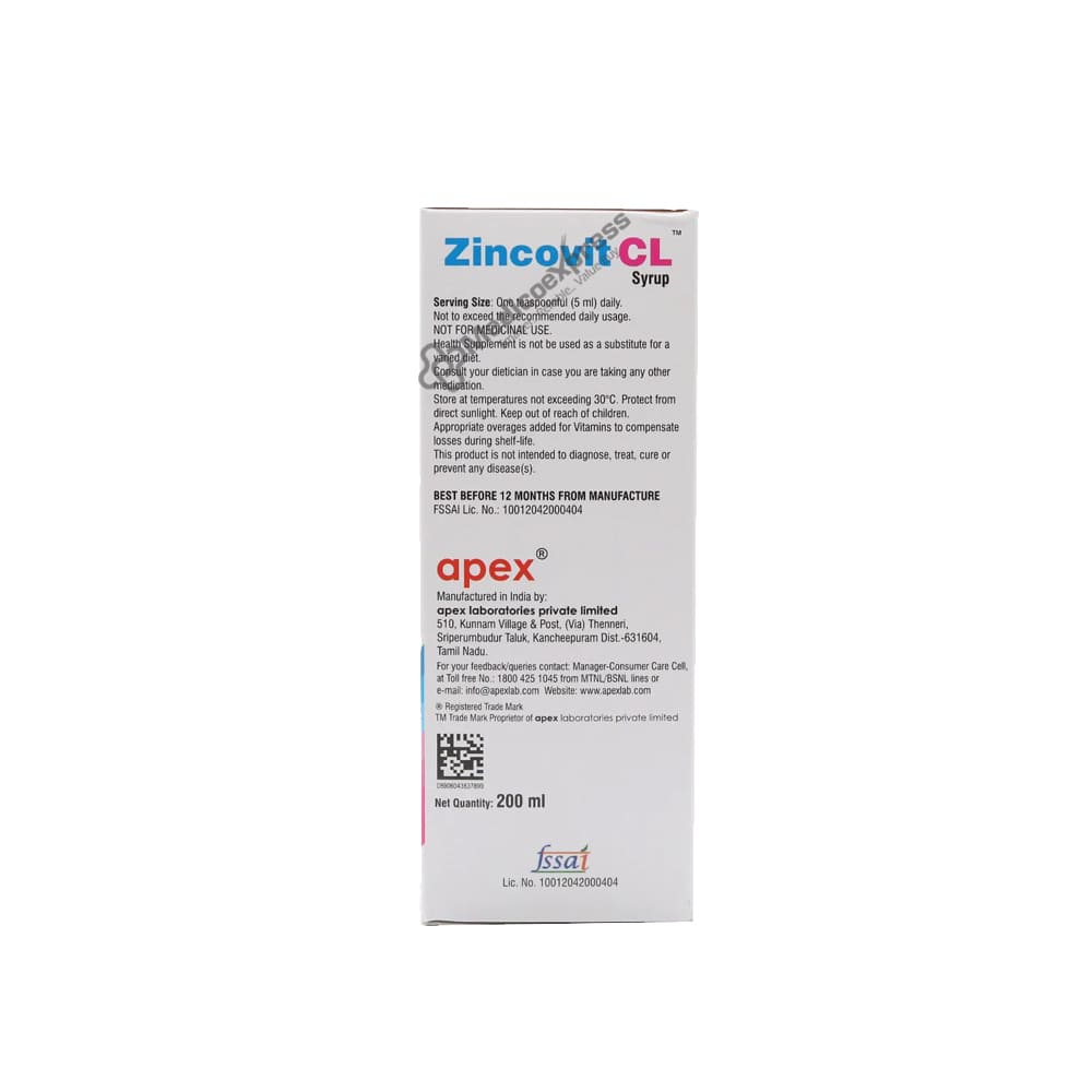 Zincovit Cl Syrup is a multivitamin, multimineral, and Lysine health supplement that promotes the body's general health. It helps the body get the additional nutrition it needs and helps with bone, tooth, hair, and skin health. It increases blood production and helps critical bodily organs work properly. With the help of this tried-and-true mixture, you may strengthen your body's immune system and enjoy balanced health..Disclaimer:For more information contact your physician.